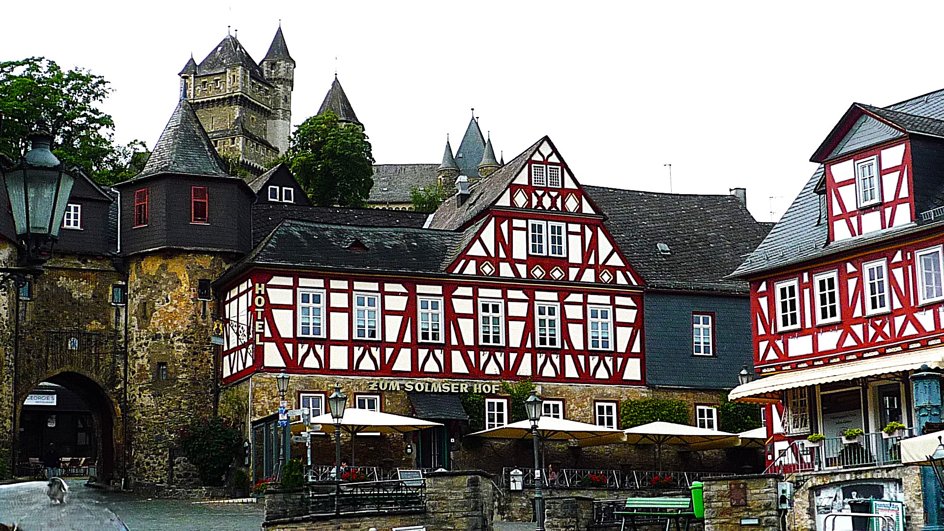 Der Abstieg vom Schloss hinunter zur Altstadt ist gesäumt mit schmucken Fachwerkhäusern und lässt erahnen, was in der Folge zu erwarten ist. Im historischen Hotel "Zum Solmser Hof", direkt am Marktplatz gelegen, kehren die Senioren zum Essen ein. Das Haus, das von einer griechischen Familie betrieben wird, hält eine umfangreiche Speisenkarte bereit. Hier lässt es sich in einem ausgezeichneten Ambiente hervorragend speisen und animiert die Herscheider, die Mittagspause in geselliger Runde auszuweiten.