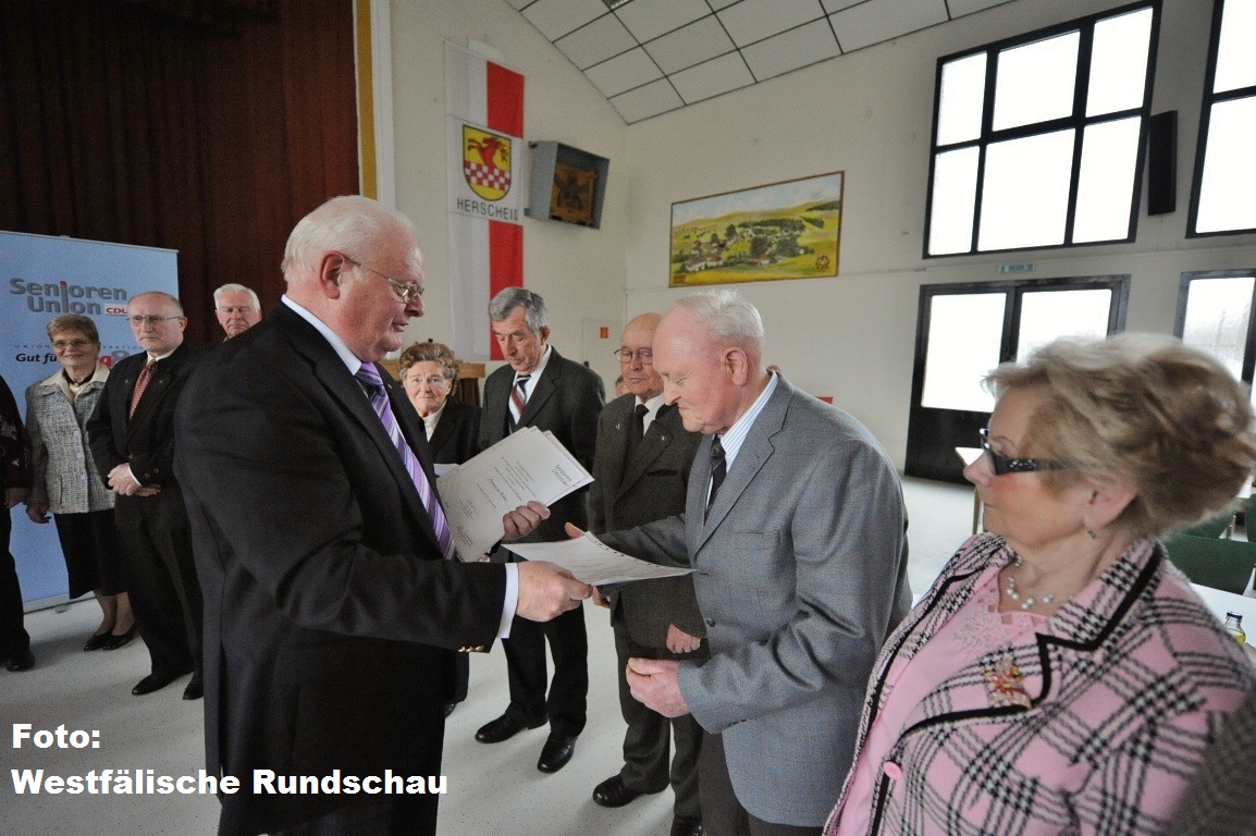 Die Ehrung des Ortsvorsitzenden übernahmen der Bezirks- und Kreisvorsitzende der Senioren Union Eberhard Bauerdick sowie das örtliche Vorstandsmitglied Annerose Kober vor. Beide würdigten ihn als Motor der Herscheider Senioren Union und dankten ihm für seinen zehnjährigen Einsatz.
