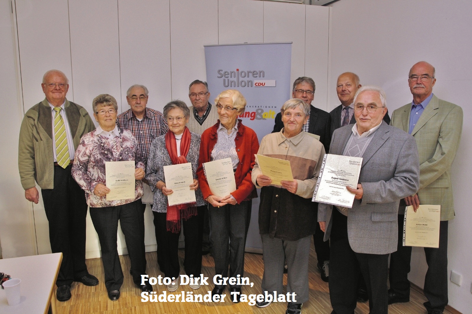 Erika Amarell, Anita und August Feldhaus, Albrecht Herrmann, Dr. Klaus Hüttebräucker, Giselher Kober, Anton Mühl, Evemie Rüther, Reinhard Schmidt und Margot Sylla. Nicht anwesend waren Edeltraud und Karlheinz Grese, die ebenfalls seit zehn Jahren der Senioren Union angehören.
