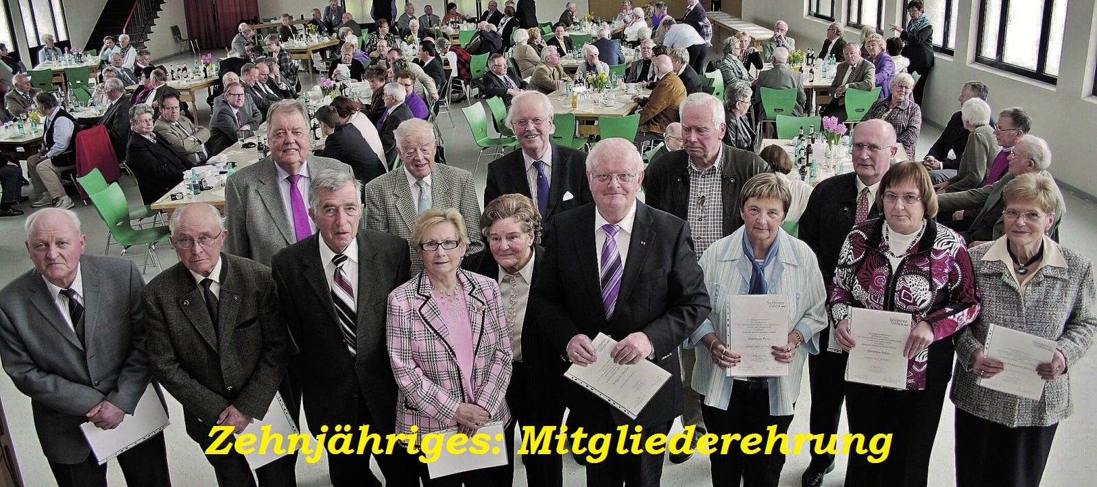 Breiten Raum nahm die Jubiläumsfeier zum zehnjährigen Bestehen der Senioren Union Herscheid ein, die am 25. April 2012 in der Schützenhalle mit 166 Besuchern begangen wurde. Im Bild festgehalten: neben den Teilnehmern die Redner, die Rentnerband, die Kinder der „Flötengruppe Ostermann“ sowie der Kabarettist Wolfgang Mette als „Tante Cilly Alperscheidt“. Das Zehnjährige wird allgemein als der Höhepunkt in der noch jungen Geschichte der Senioren Union Herscheid eingestuft.