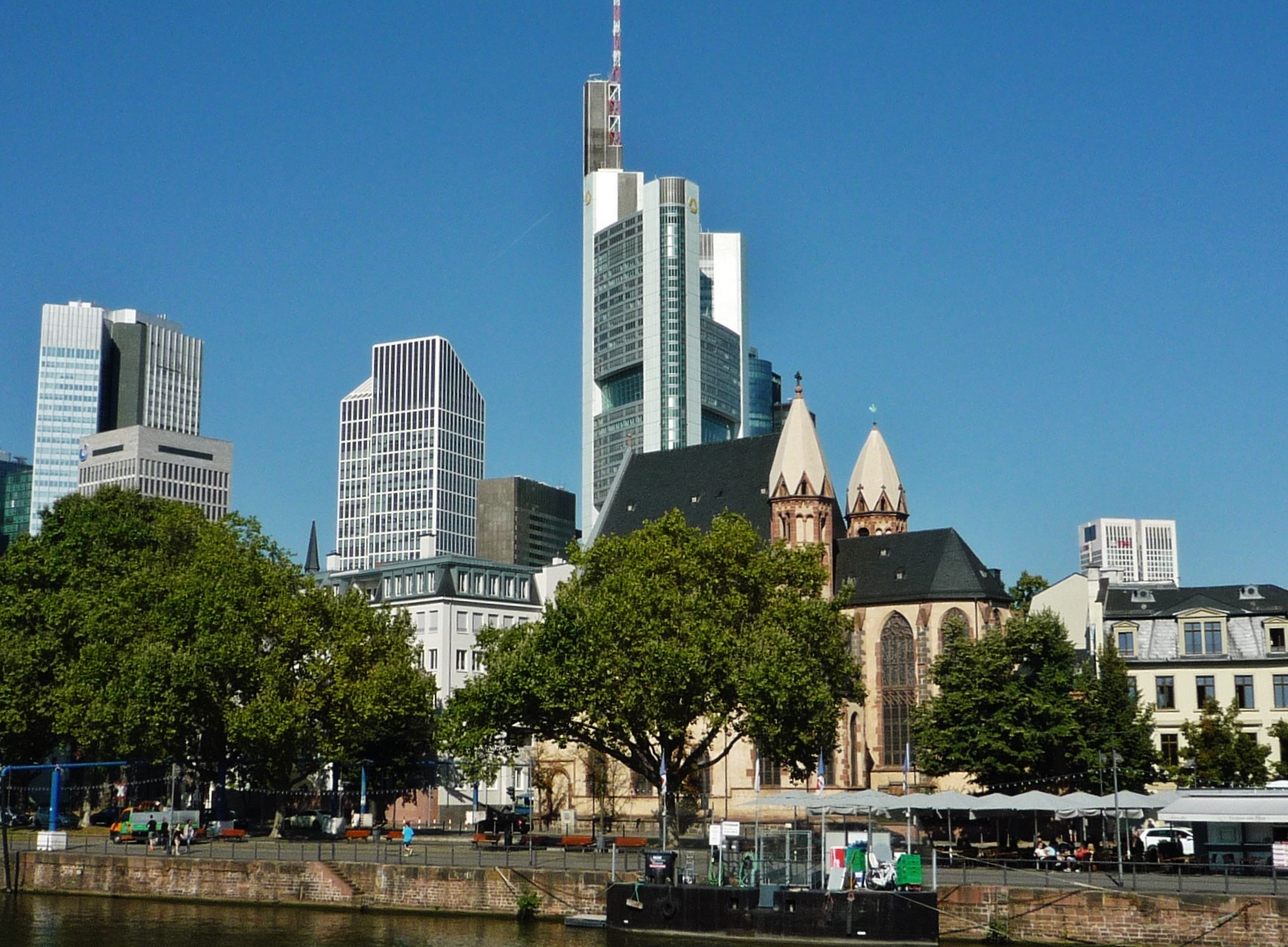 Am „Eisernen Steg“ beginnt bei hochsommerlichen, aber angenehmen Temperaturen die Rundfahrt. Natürlich bevorzugen die meisten Senioren das Oberdeck des Schiffes, haben sie doch von hier aus die beste Aussicht auf die Frankfurter Silhouette. Angereichert mit Wissenswertem aus der Geschichte sowie der aktuellen Entwicklung der Stadt über die Lautsprecheranlage ziehen die markanten Bauwerke der Mainmetropole vorüber. Die Hochhäuser der Banken-, Finanz- und Versicherungswelt sowie der weithin sichtbare Büroturm der Europäischen Zentralbank lassen die ältere Bausubstanz winzig klein erscheinen. Ein wahrhaft grandioser Anblick! Nicht umsonst wird die Mainmetropole als „Mainhattan“ bezeichnet, kommt sie doch dem amerikanischen „Manhattan“ mit den zahlreichen Wolkenkratzern durchaus, allerdings bescheidener, nahe.